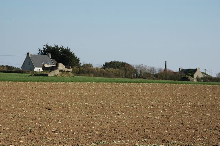 Vue de l'ensemble fortifié situé à l'ouest de Plougonvelin de part et d'autre de la Départementale n° 85 : encuvement bétonné au sud de la routeImmatriculation