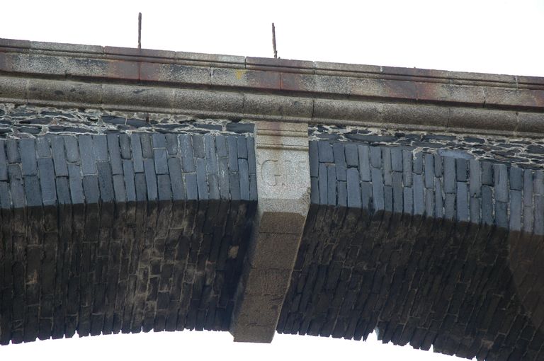 Vue du pont à une seule arche en appareil de schiste renforcé par une maçonnerie en grès de l'îlot des Capucins. Il porte au sud la date de 1861 et les lettres G M pour Génie MaritimeImmatriculation