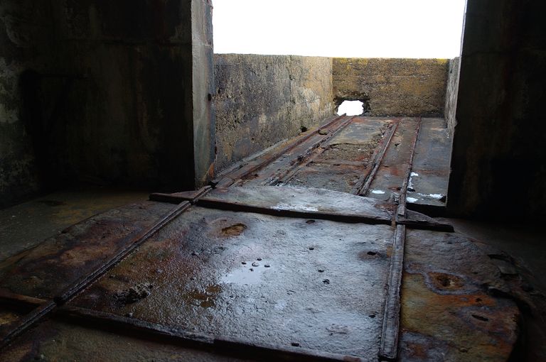 Roscanvel, pointe Robert : abri du groupe de deux projecteurs (60 cm et 90 cm de diamètre), plaque de translationImmatriculation