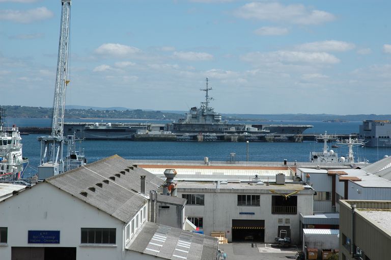 Vue de l'arsenal de Brest depuis la route de la Corniche : le porte avion Clémenceau (R98 : désarmé le 1er octobre 1997, en attente de démolition. Appelé Q-790 depuis 2002.) dans l'attente de son démantèlementImmatriculation
