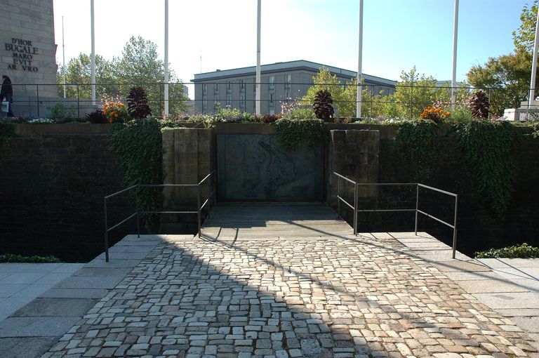 Vue des vestiges des fortifications d'agglomération de Brest dans le square Mathon : chaussée et soubassement de la porte de Saint-Louis percée en 1821 dans la demi-lune de Landerneau datant de la fin du 17e siècleImmatriculation