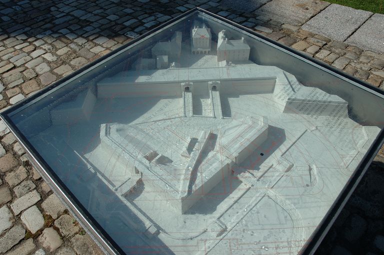 Signalétique mise en place pour expliquer la présence des vestiges des fortifications d'agglomération de Brest dans le square Mathon : plan-relief de la demi-lune de LanderneauImmatriculation