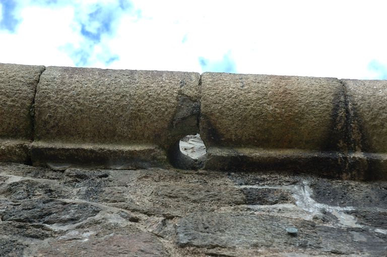 Vue de détail d'un emplacement de descente d'eau pluviale dans le cordon en graniteImmatriculation
