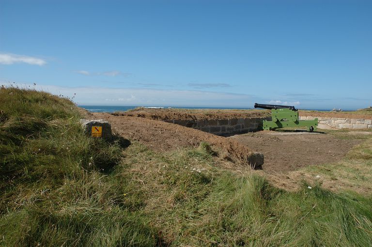 Vue de l'ensemble fortifié de Lanildut : reconstitution et mise en situation d'une pièce d'artillerie sur affût de la 2e moitié du 18e siècle (pièce de marine de 12 livres modèle 1786 de 1 610 kilogrammes coulée en 2007)Immatriculation