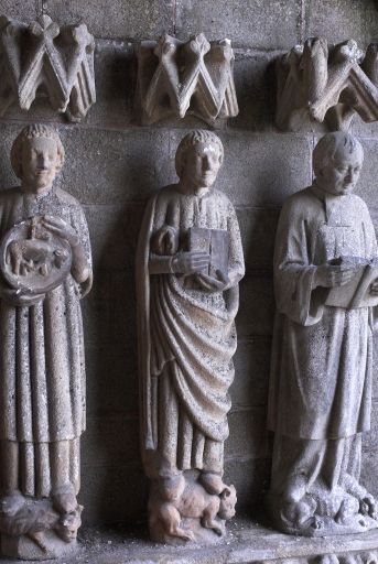 Ensemble de 4 statues : Saint Pierre ; Vierge (?) ; Saint diacre ; Saint (?), et d'une tête,