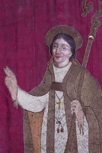 Bannière de procession paroissiale : Saint Erblon ou Herbland de Nantes, Christ en croix,