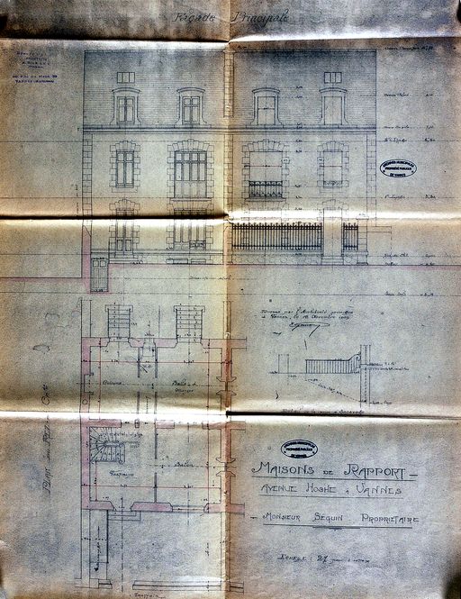 Plan des rez-de-chaussée et élévation des façades sur rue, par Edmond Gemain, 15 novembre 1909. AM Vannes 5I162.Immatriculation