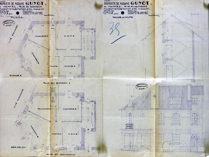 Plans, façade et coupe dressés par l'architecte Léon Belley pour madame Guyot le 18 mars 1939. AM Vannes 5I 162.Immatriculation