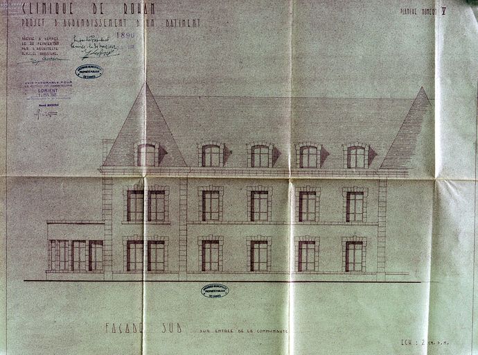 Projet d'agrandissement du bâtiment principal, par G. Caubert de Cléry, 20 février 1948. Façade sud sur entrée de la communauté. AM Vannes 1G59.Immatriculation