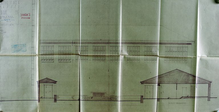 Façade est de l'église Saint-Pie X par G. Caubert de Cléry, 16 août 1956. AM Vannes 1G59.Immatriculation
