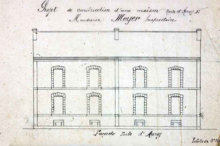Elévation des deux maisons dressée pour la demande d'alignement de M. Meyer par Normand, 2 octobre 1892. AD Morbihan S 246.Immatriculation