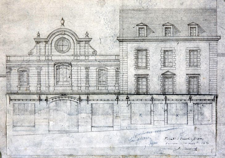 Projet d'agrandissement par Joseph Caubert, janvier 1920 : élévation. AD Morbihan 149 J 303.Immatriculation