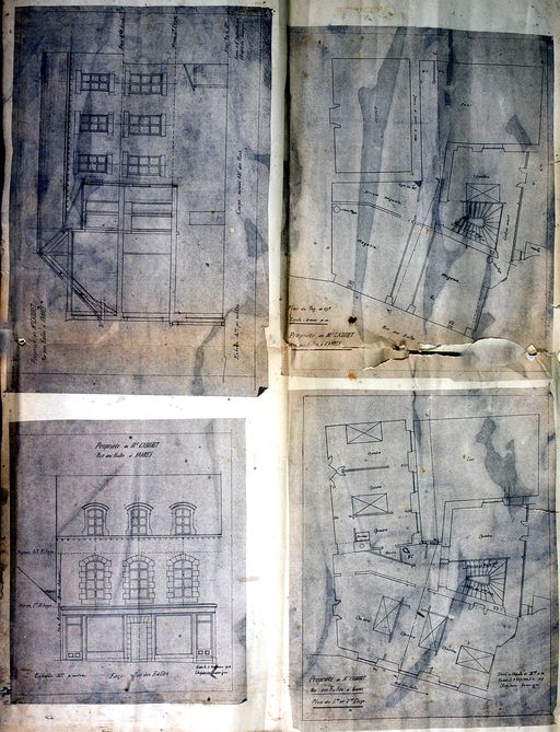 Construction d'un immeuble rue des halles pour M. Cadoret par J. Caubert, 1913 : plans au sol et de l'étage, élévation et coupe. AD Morbihan 149 J 302.Immatriculation