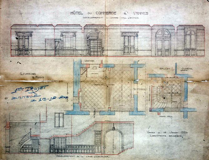 Projet d'agrandissement de l'hôtel : développement du hall d'entrée. Dessin par Joseph Caubert de Cléry pour Mme Delory, 18 janvier 1924. AD Morbihan 149 J 276.Immatriculation