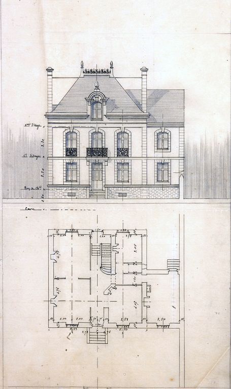 Projet pour la maison Criaud rue Hoche par Joseph Caubert de Cléry : élévation sur jardin, 1909 ?. AD Morbihan 149 J 350.Immatriculation