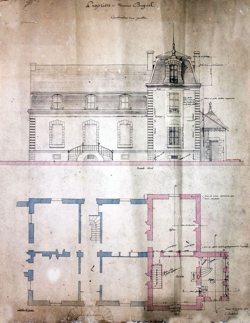 Elévations et plans d'un agrandissement de la propriété Buguel par Joseph Caubert de Cléry, 1911. AD Morbihan 149 J 362.Immatriculation