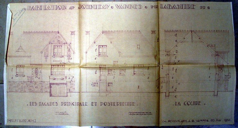 Elévations et coupe d'une habitation pour M. Labastire, par Charles Perrin, 20 mai 1932. AM Vannes 5I162.Immatriculation