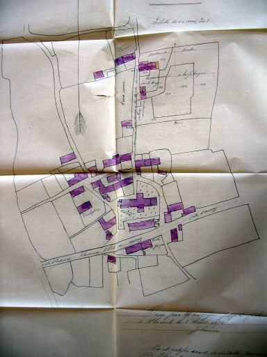Plan du bourg, dressé par Jehanno le 2 août 1878, avec emplacement des maisons achetées pour servir d'école de filles.(AD Morbihan, 2O 161/ 1337)Immatriculation