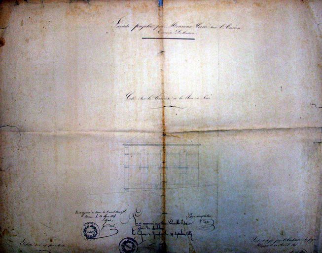 Plan des trois façades par Marius Charier : façade rue du Féty. Litige entre l'architecte et la ville à propos de l'emmarchement rue de la Garenne. Août 1845. AM Vannes 1O 216Immatriculation