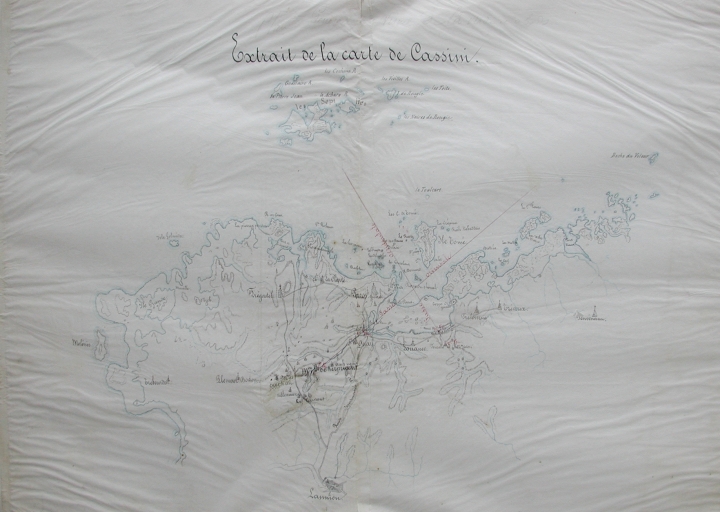 Extrait de la carte de Cassini : la rade de Perros et l'alignement des 4 feux en projet, 1888, d'après les travaux du lieutenant de vaisseau Guépratte en 1856 (AD 22)Immatriculation