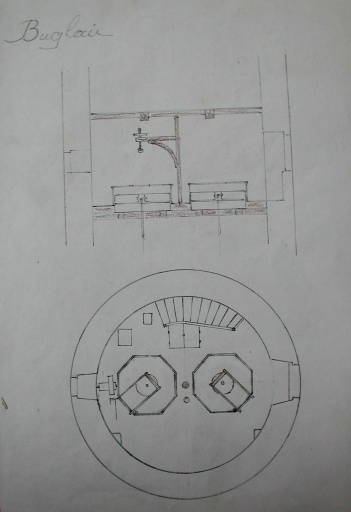 Vue du système de levage des meules avec la potence et la vis sans fin (dessin de Jean Peillet)Immatriculation