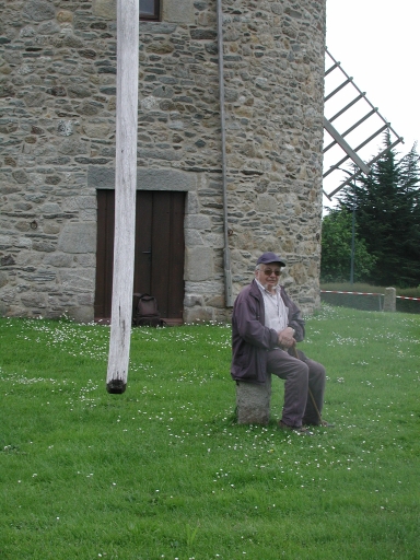 Jean Peillet, l'amoulangeur qui a restauré le moulin, assis sur l'une des 8 pierres (poutres en bois à l'origine), situées aux 8 points cardinaux, accrochées à un cabestan pour faire tourner la charpente mobile du moulinImmatriculation