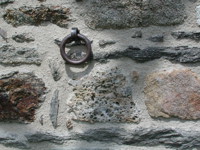 Détail : Nivellement général, point géodésique du moulin, inséré dans la maçonnerie refaite à neuf (pierres de 'tout venant', granite, schiste, gneiss) pour attacher le cheval du meunierImmatriculation