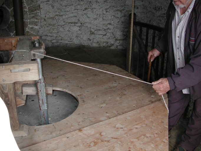 Le meunier débloque la trémie et actionne l'auget avec un bout pour libérer la quantité de grainsImmatriculation