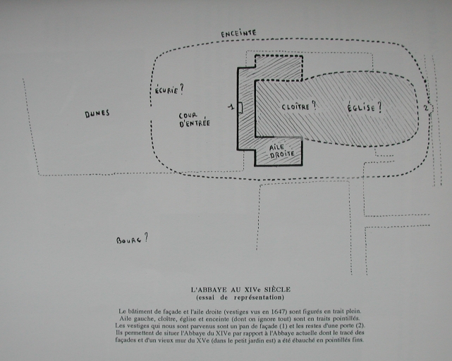 Dessin : essai de représentation du plan de l'Abbaye au 14ème siècle, avec le mur d'enceinte (J. Collemen, Amis du vieux St-Jacut)Immatriculation