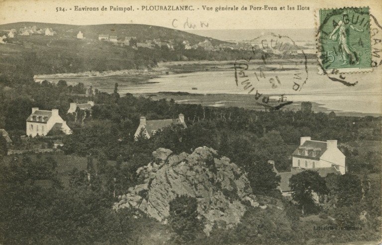 Vue du front de mer de Pors Even en 1921 : remarquer la répartition des boisements au bord de la côte (AD 22, 16 Fi)Immatriculation