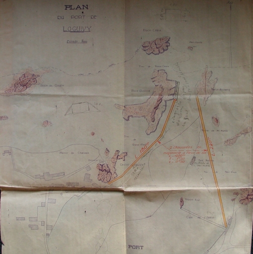 Plan daté de 1951 : Projet de réalisation de 2 chaussées en maçonnerie, entre le Castel et Roc'h Quionce et entre Roc'h Du et Toul ar Bouzard (AD 22)Immatriculation