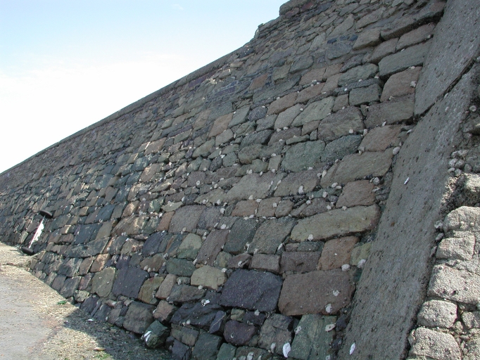 Vue du mur de quai de la jetée en pierre de granite taillée : remarquer le fruit du mur Sud-Ouest assez accentuéImmatriculation