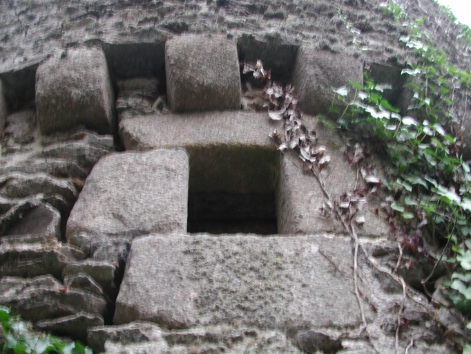 Vue d'une ouverture au-dessous de l'encorbellement en pierres de tailleImmatriculation