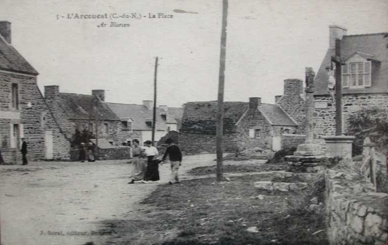 La place du village de l'Arcouest 1920 : remarquer les croix et le bâti traditionnel qui a été peu transformé (carte postale, collection particulière)Immatriculation