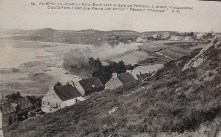 Le front de mer du village de Pors Even : vue des maisons alignées en flanc de coteau, début 20ème siècle (collection particulière)Immatriculation