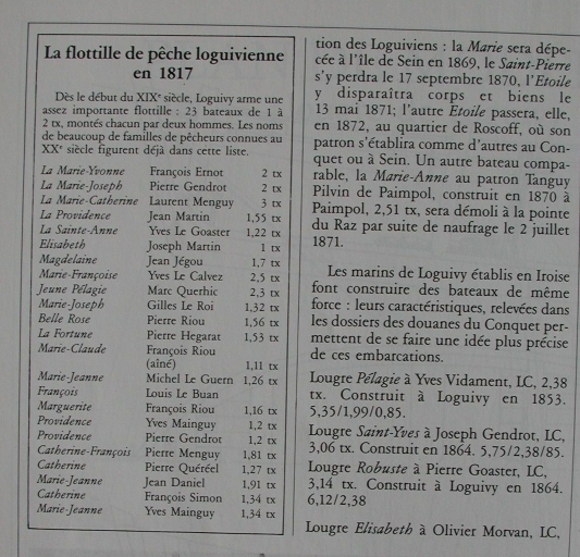 Dans : 'Des Paimpolais en Iroise, A Durzunel, la renaissance d'un canot loguivien'/ Clochon, Jean-Pierre, Le Chasse-Marée n° 20, Douarnenez : Editions Le Chasse-Marée/Armen, 1985, p. 58.