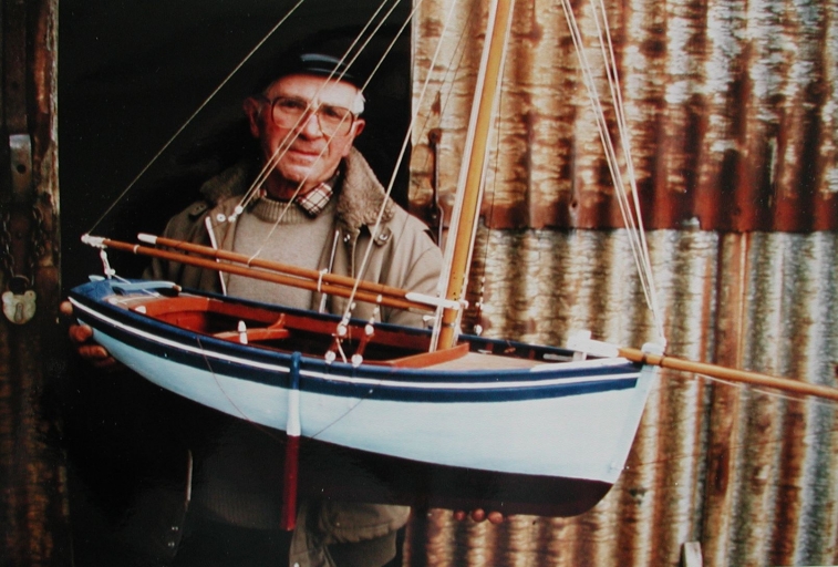 Jean Kerleau, charpentier de marine de Lanmodez avec la maquette d'un homardier de Loguivy, 1989Immatriculation