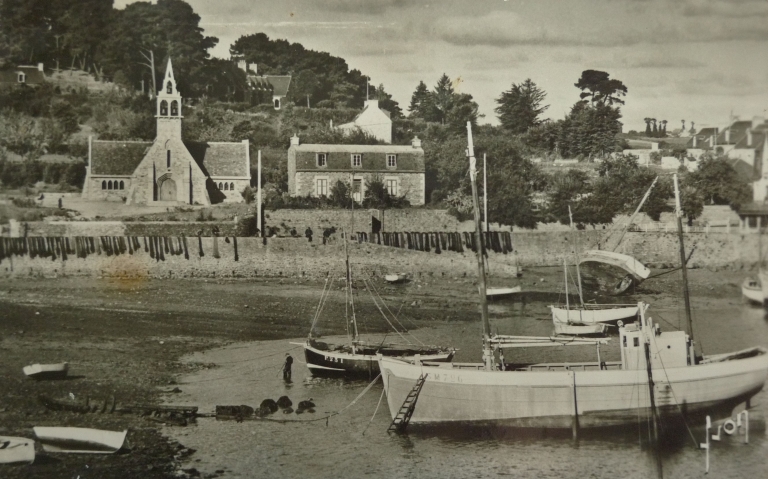 Le 'Tourmentin' de la famille Riou, échoué devant la grève de l'église : il a conservé son gréement (collection particulière)Immatriculation