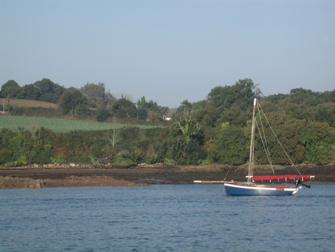 Vue du 'Scravic' avec son gréement, au mouillage, devant KeraretImmatriculation