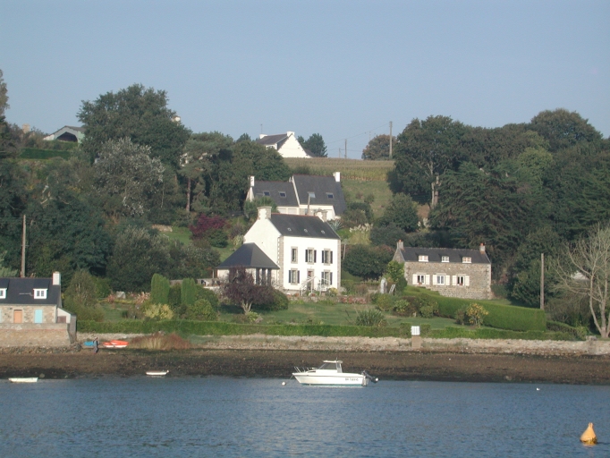 En amont de la baie de Palamos : la maison à la façade grise ('Gralange'), située en face de la masion haute au pignon blanc, ancienne école de la Roche Jaune au début du 20ème siècle (propriété privée aujourd'hui)Immatriculation