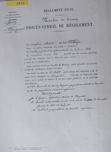 PV de récolement des travaux du moulin de Kerousy, 1873, 1ère feuille (AD 22)Immatriculation