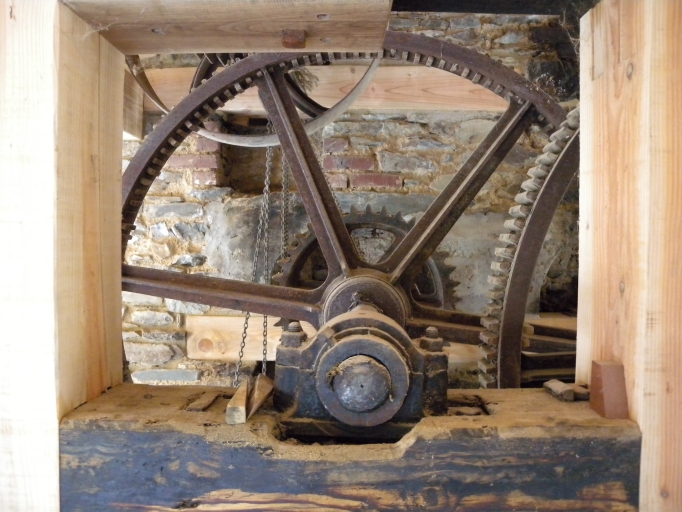 Vue de l'une des roues principales d'entraînement, dentelées et en fonte : remarquer l'échancrure dans laquelle passait le mécanisme des spatules à dégrossirImmatriculation