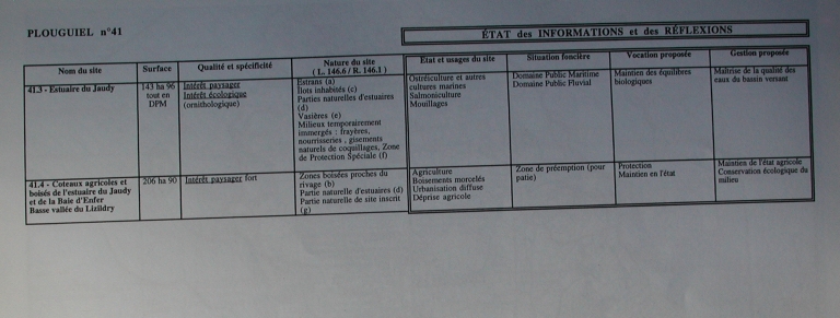 Tableau : état des informations et des réflexions sur les espaces remarquables de la commune de Plouguiel (DIREN Bretagne, 1998)Immatriculation