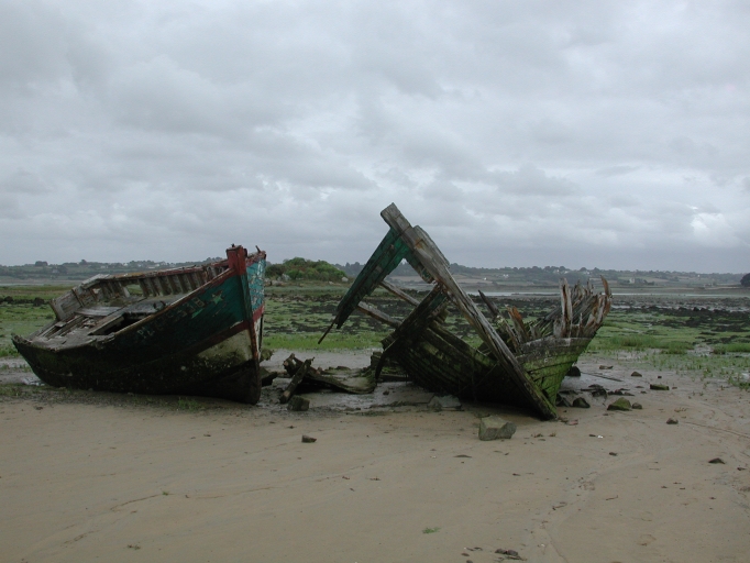 Vue des épaves de bateaux de travail échouées dans l'enclos de la vasièreImmatriculation