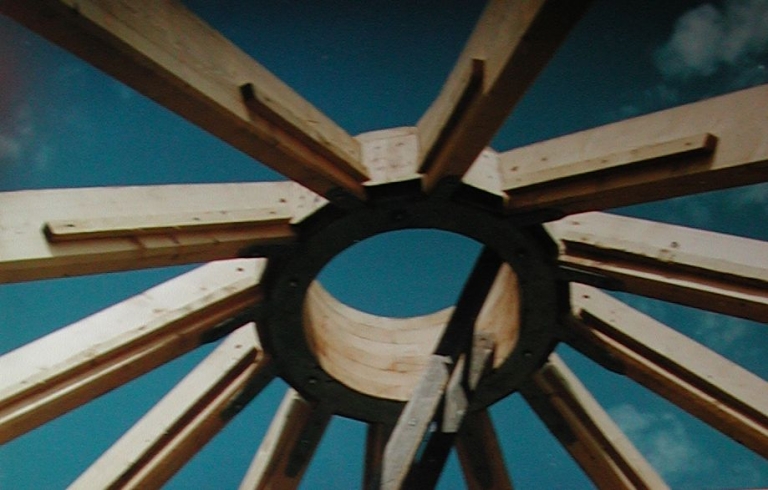 Vue de détail du chassis, poinçon en forme de cheminée, en lamellé collé (collection particulière)Immatriculation