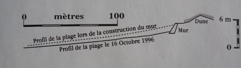 Profil de la plage devant le camping des Dunes en Penvénan, levé du 16 octobre 1996, comparé au profil lors de la construction du mur, avec exagération des hauteurs (SMVM, Trégor-Goëlo, Pinot, 1997)Immatriculation