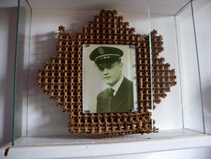 Vue d'un support pour présenter des photos, réalisés avec des formes de sabords en bois par un marin de PordicImmatriculation