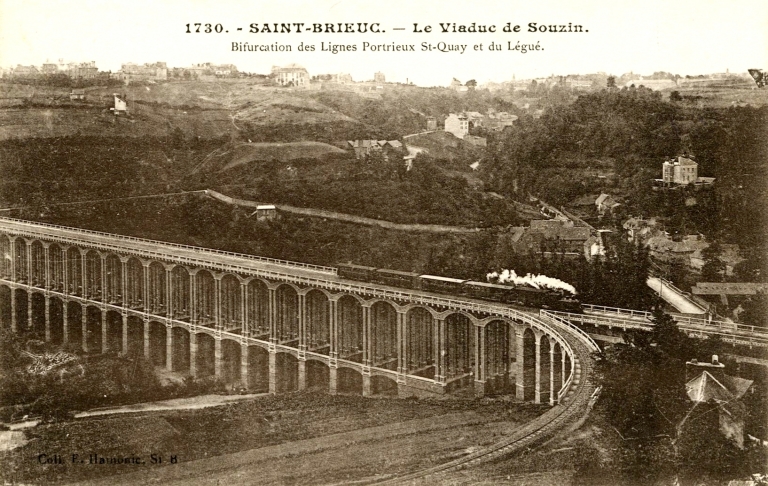 Le train à la sortie du viaduc de Souzain à hauteur de l'embranchement courbe desservant la ligne de chemin de fer en direction du Légué, 1er quart du 20ème siècle (AD 22)Immatriculation