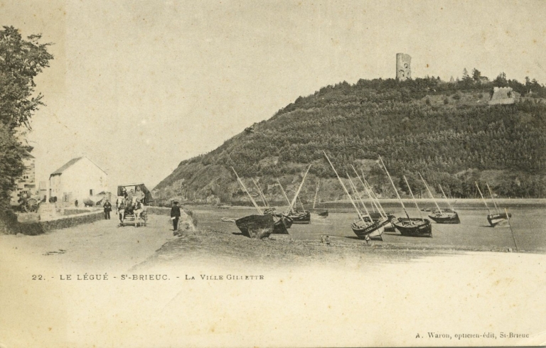 Vue de la Ville-Gilette : remarquer le chemin de halage et les bateaux de pêche à l'échouage, début 20ème siècle (AD 22)Immatriculation