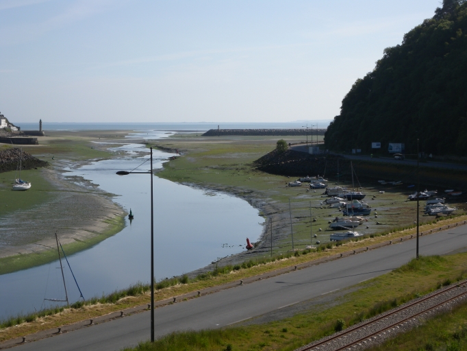 Vue de l'embouchure du Légué à marée basse : remarquer l'ancienne ligne de chemin de fer, concurrente du bornage et le port des CessonnaisImmatriculation